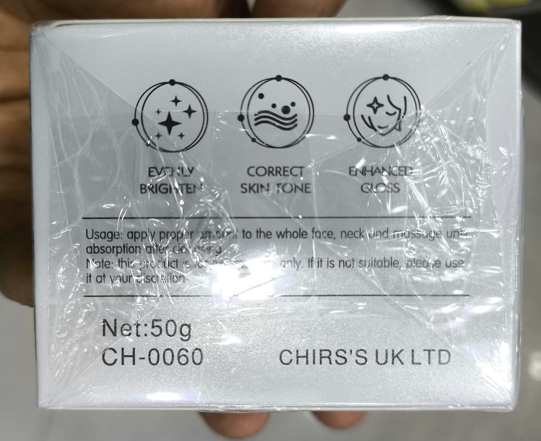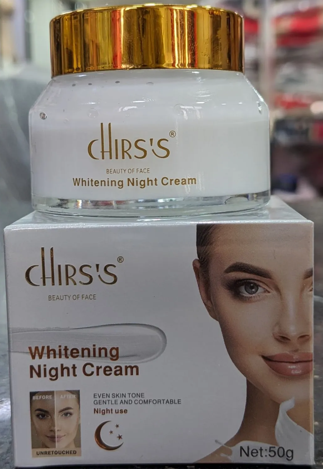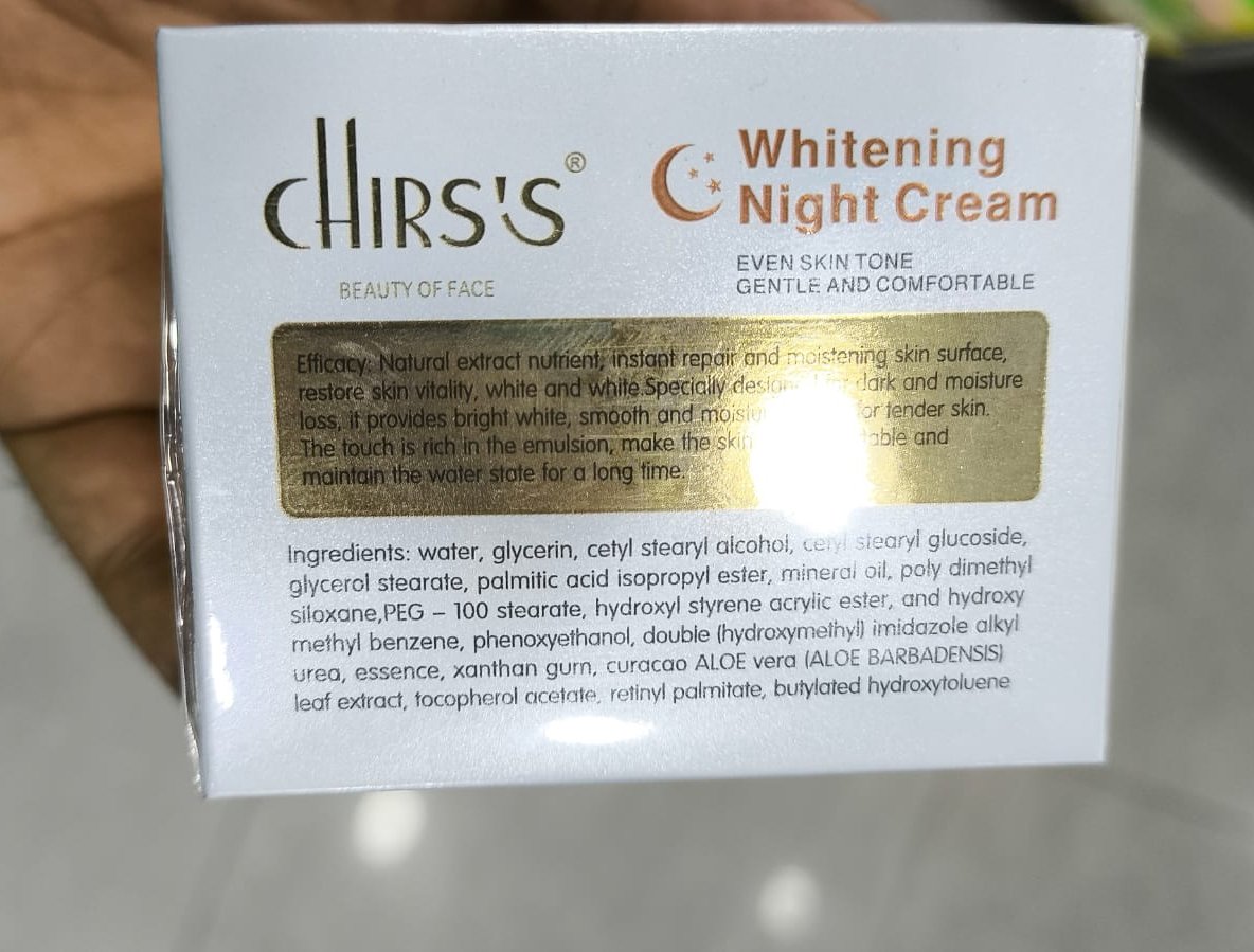 • introducing chirs’s Night Whitening Cream gentle and soft can clean the skin surface oil,and dirt ,replenish skin moisture .Even Skin tone .Comfortable and gentle for all skin types