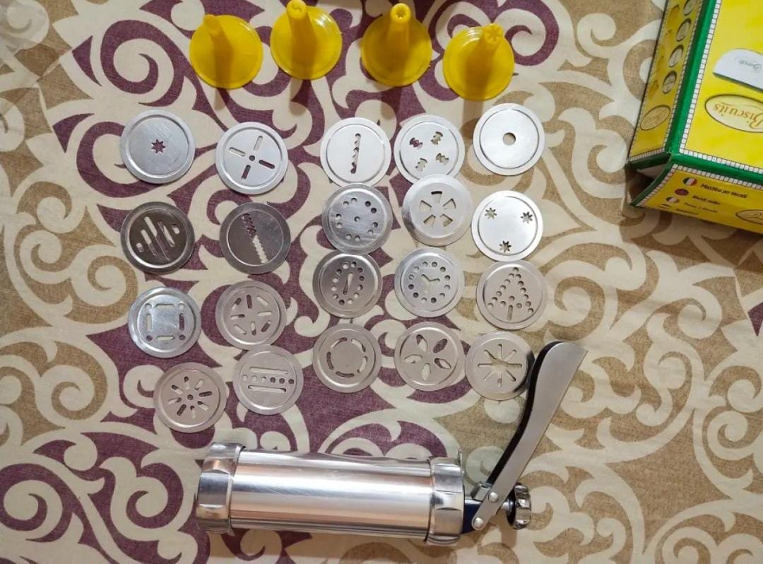 Biscuit Decorating kit :1x biscuit press, 20 x interchangeable cookie discs, 4 x icing tips.You can make delicous cookie at home or even churros .This cookie press set is a great gift ideal to those like DIY cookies in the kitchen.