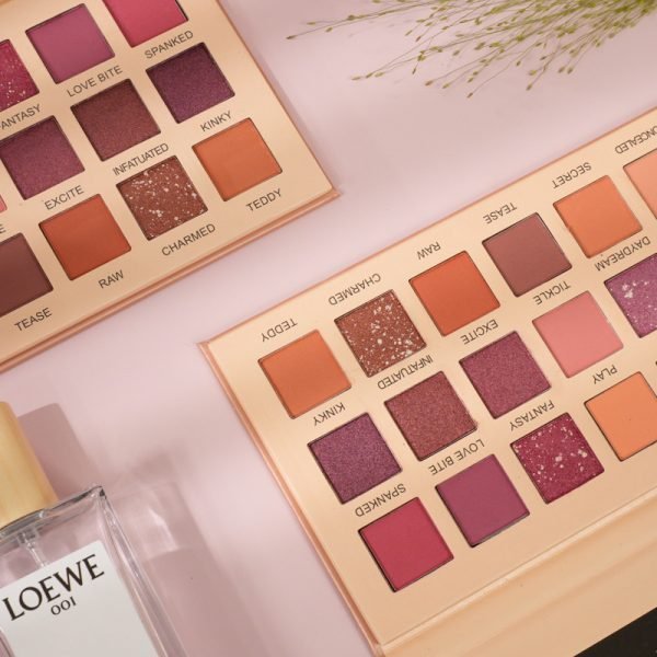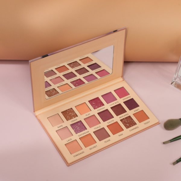 This palette contains:– 18 x Eyeshadows in Bare, Crave, Play, Fantasy, Love Bite, Spanked, Lace, Daydream, Tickle, Excite, Infatuated, Kinky, Concealed, Secret, Tease, Raw, Charmed, Teddy