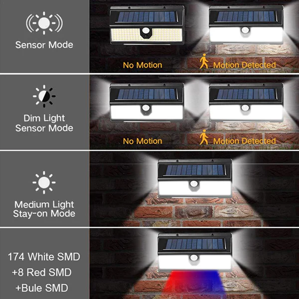It can act as a light source and as an emergency searchlight thanks to the switching of blue and red light at the bottom.Choice of night continuous low mode, sensor mode, sensor and low night mode and emergency mode with red and blue flashing light.Number of LEDs: 172 white, 9 red, 9 blue.Sensor angle : 120 degrees.