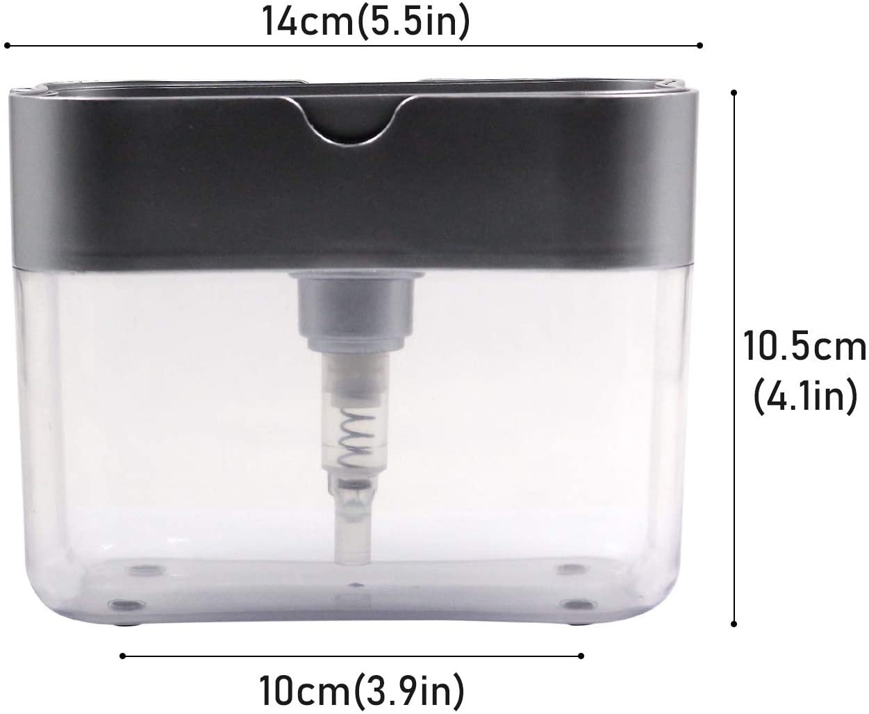 The container has a large capacity so that you don?t need to refill it frequently. Works with all kind of liquid soaps. Dispense the perfect amount of soap onto the sponge, extremely easy to use.? Sink dispenser with attached caddy holds sponges, scrubbers, rags, scouring pads in one convenient place while keeping water off of kitchen counters. No more stopping to grab the soap bottle. Any other sponge or scrubber will work with it too!