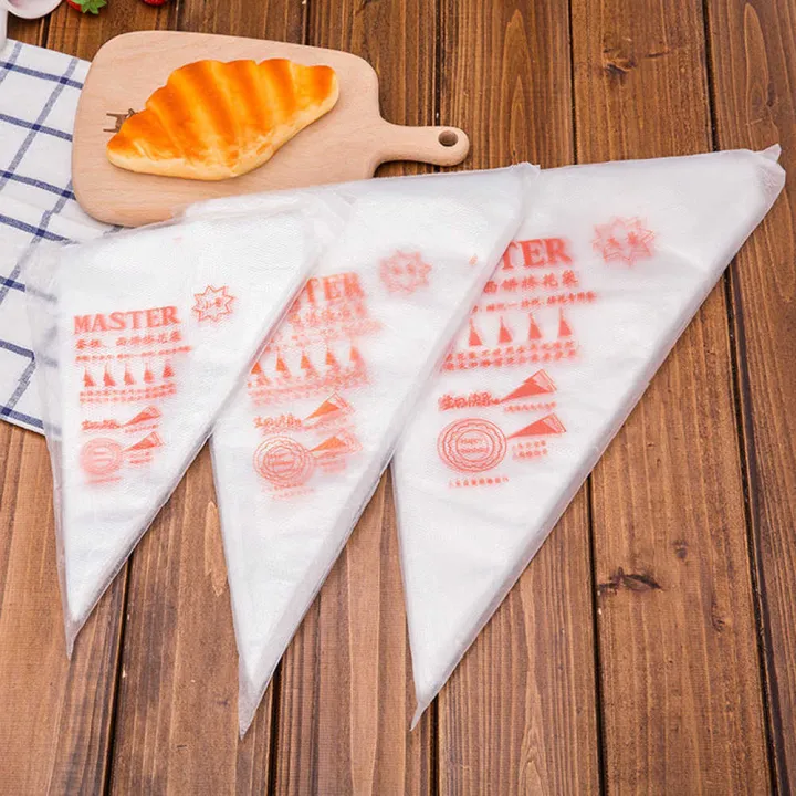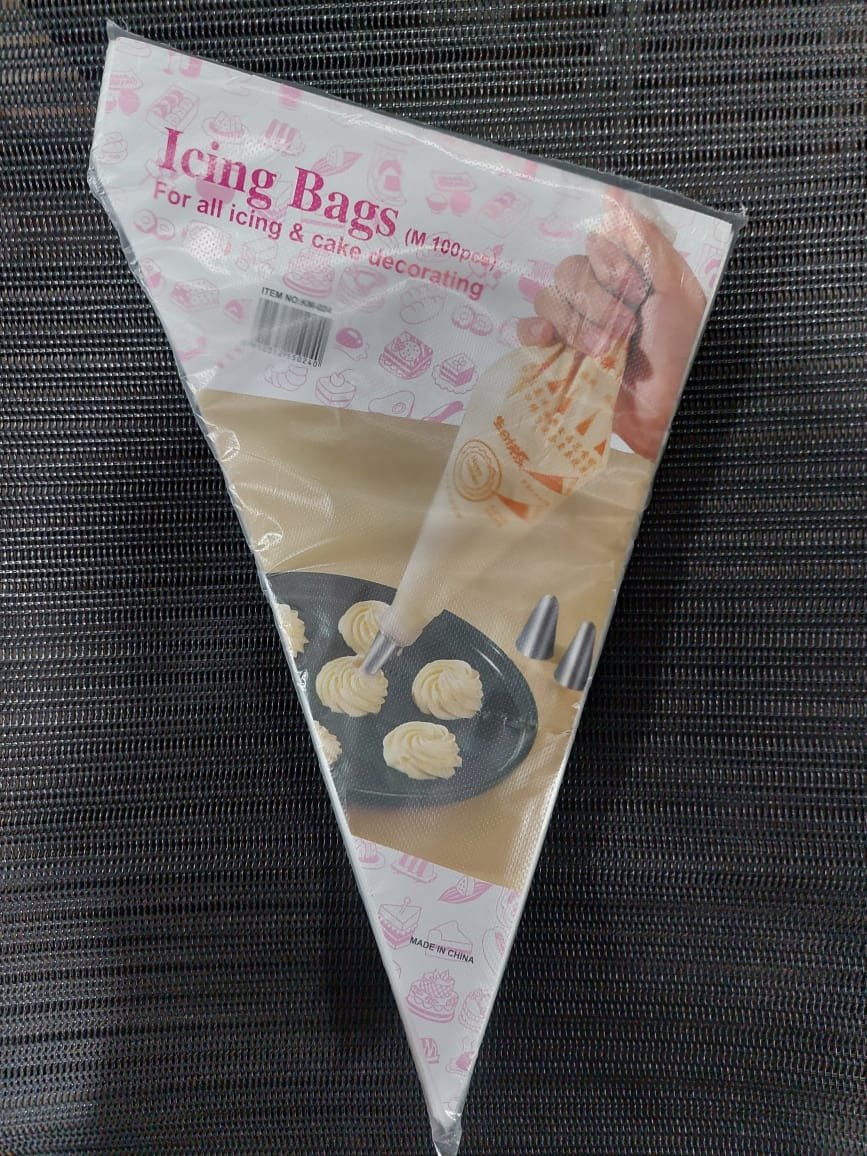 Icing bags, also known as pastry bags or piping bags, are conical or cylindrical-shaped bags made from cloth, disposable plastic, or reusable silicone, used by bakers, pastry chefs, and cake decorators to pipe various decorative elements, frostings, and fillings onto cakes, cupcakes, cookies, and other desserts, enabling precise and creative cake decorating.