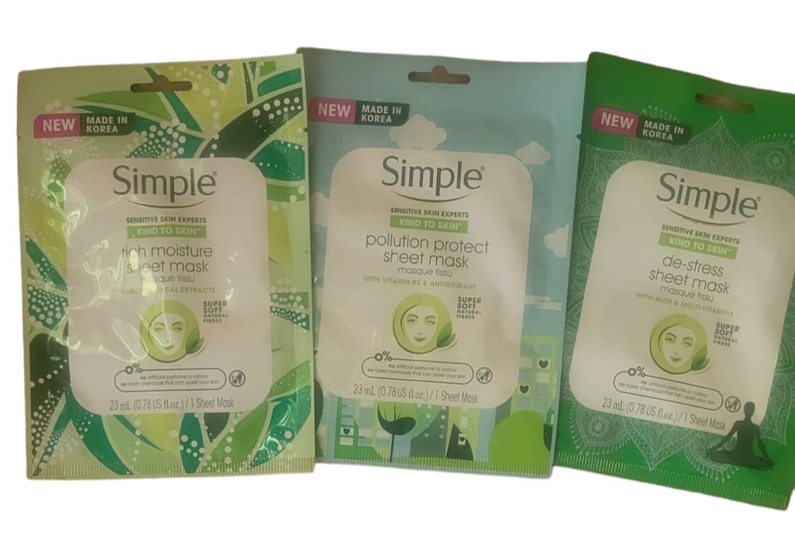 Simple Kind to Skin De-Stress Sheet Mask helps to brighten tired skin, while the Daily Skin Detox Purifying Charcoal Sheet Mask enriched with bamboo charcoal detoxifies the skin.