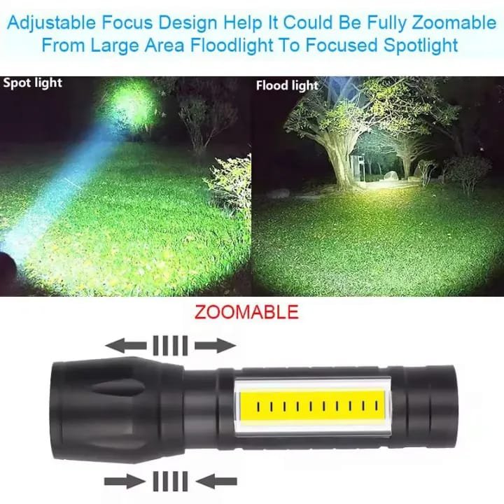 The Super Bright USB Rechargeable Flashlight combines powerful illumination with convenient portability. Featuring an ultra-bright front LED beam and an integrated side COB light, it?s perfect for close-up tasks, camping, travel, and emergency situations. Crafted from durable plastic for lightweight strength, it offers reliable performance in a compact design. Powered by USB rechargeable technology, this flashlight is eco-friendly, cost-effective, and always ready when you need it?making it an essential tool for your home, car, or outdoor adventures.