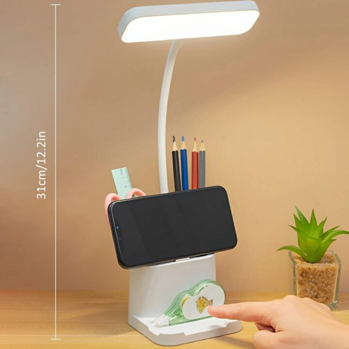 • Clutter-Free Organizer: The LED desk lamp’s color is white, and the size is small. The small LED desk lights for home office feature pen holders and a phone mount. It’s convenient for placing the phone, photos, pens, rulers, or tools.